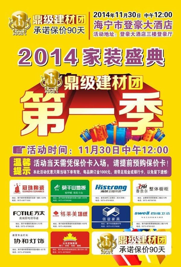 时日,一场强大的家装盛典——鼎级建材团将在这里上演一场前所未有的大聚惠,保证让你过足眼瘾,满载而归。本次活动强大阵容:爱体育官方网站全能吊顶、冠珠陶瓷、莫干山地板、香奈儿整体橱柜、方太厨电、格莱美墙纸、信谊家具、四维卫浴等盛装出席,亮眼有木有?