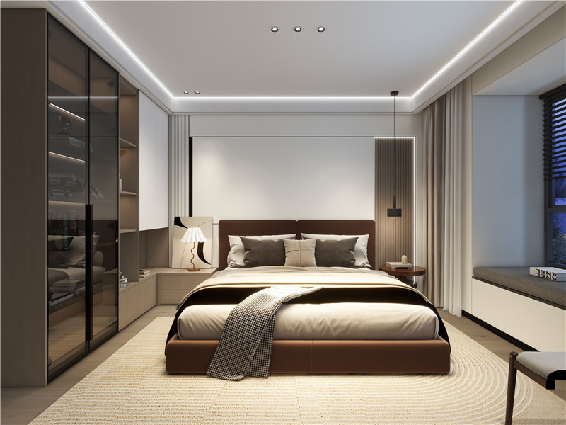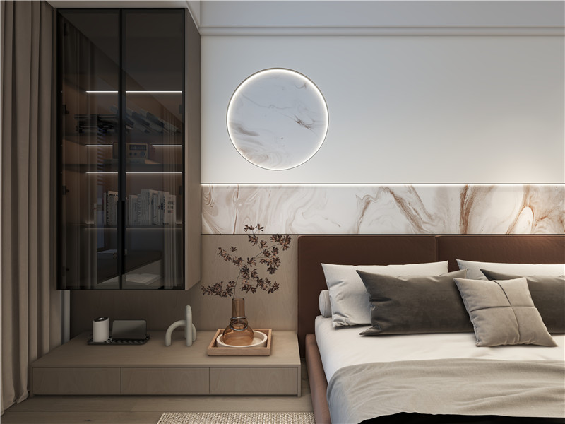 走进卧室,更是仿佛进入了一个温暖自愈的港湾。床头背景墙一轮圆月高挂,营造出夜晚的宁静氛围,9A 木健康墙板带来自然舒适的触感,白色、暖灰色和原木色的搭配让整个空间充满温馨,只让人沉浸宁静的睡眠时光。