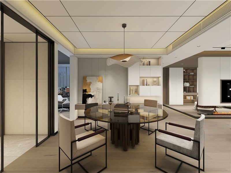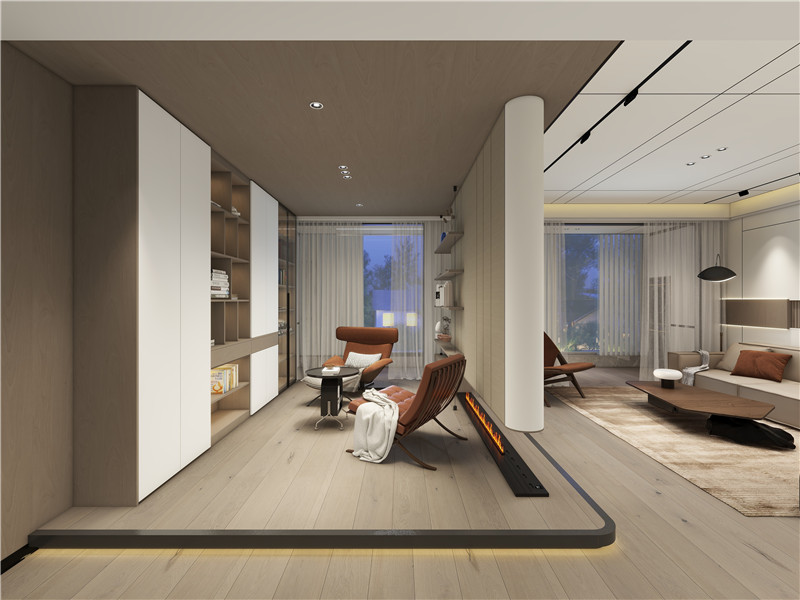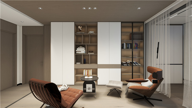 书房是主人宁静思考的地方。这里运用了开放与封闭陈列的双重方式,打造出一个安静舒适的学习和休闲空间。2个深棕皮质沙发躺椅、一个茶色圆形茶几,散发着自然的气息,让人能够静下心来沉浸在自我的世界里。