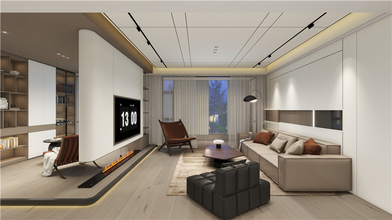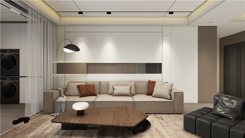 整屋以白色、暖灰色和原木色为主,温馨的色彩和谐交融,点缀些许金色元素,部分空间以白色作为中间色搭配调和,带有一丝复古韵味,整体空间呈现出休闲舒适、温暖自愈的视觉效果。