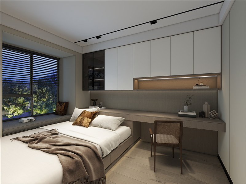 次卧是一个充满多功能实用性与温馨氛围的空间。榻榻米床与书桌的巧妙结合,既节省了空间,又为房间增添了独特的韵味。