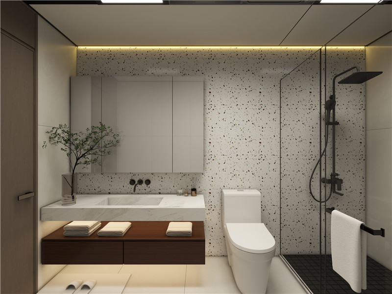 卫生间同样展现出简约时尚的魅力。博格铝蜂窝大板的运用,为空间增添了大气与质感;线性取暖器巧妙地融入其中,不仅在功能上为浴室提供了温暖舒适的环境,其简约的设计与博格铝蜂窝大板相互映衬,营造出时尚而又实用的氛围。