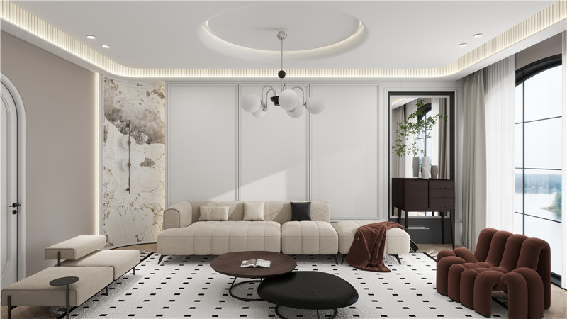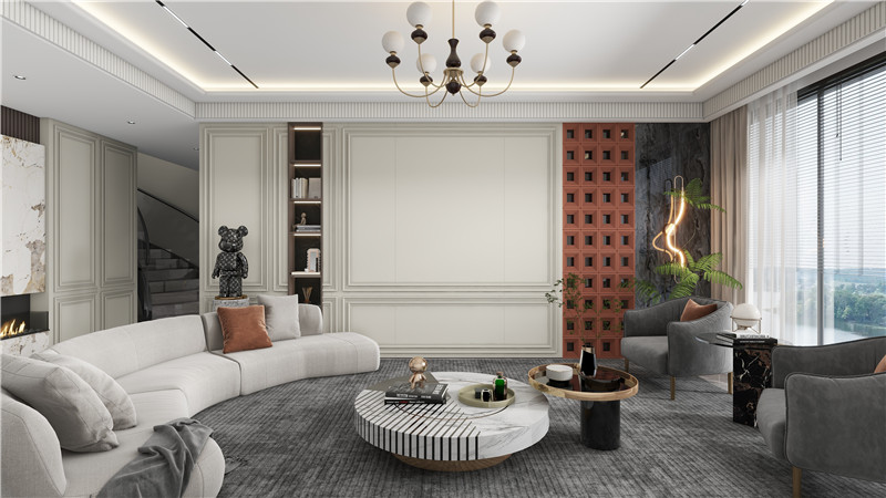 ▸ 贯穿岩板+几何纯色:深浅错层设计拉伸视觉纵深,别墅轻奢一气呵成;
