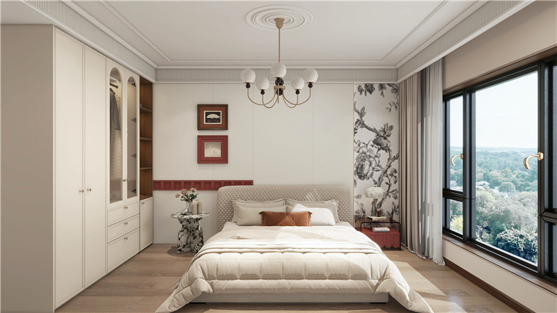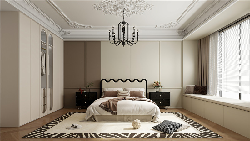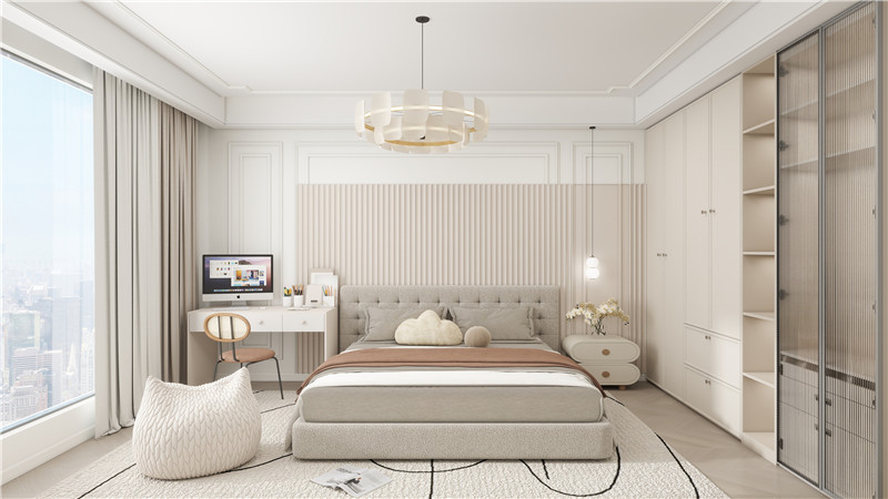 ▸ 同色墙柜一体化:飘窗、定制柜、床头背景墙一体化设计,放大空间视觉效果,颜值度爆表。